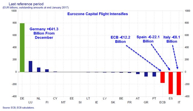 По итогам января стало известно, что через систему TARGET2 из банковских систем Италии и Испании было выведено порядка 30 млрд евро, в то же время Германия столкнулась с притоком капитала в 41 млрд евро. Аналогичная ситуация наблюдалась в преддверии долгового кризиса в ЕС в 2011 году.