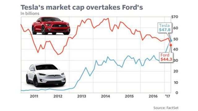 Ранее компания Элона Маска обогнала по капитализации другого крупного американского автопроизводителя - Ford. После того как котировки Tesla взлетели на торгах на Нью-Йоркской бирже на 8% до $293, капитализация компании достигла отметки $46,76. В то же время стоимость бумаг Ford Motors опустилась на 2%, а капитализация - до $44,3.