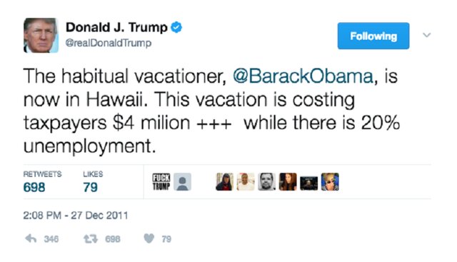Трамп часто критиковал Обаму в своем твиттере за то, что тот путешествует на деньги налогоплательщиков.
