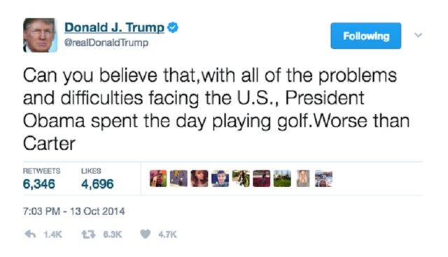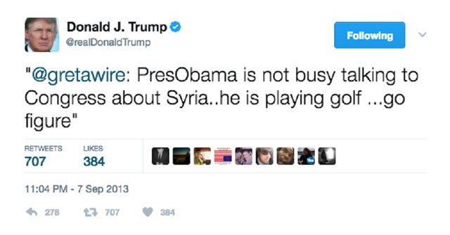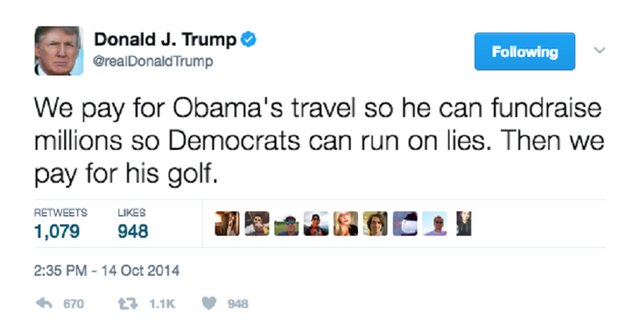 В 2014 году Трамп написал в своем твиттере: "Мы платим за путешествия Обамы столько, что он может собирать миллионы, так что демократы могут и дальше продолжать врать нам. А еще мы платим за его гольф."