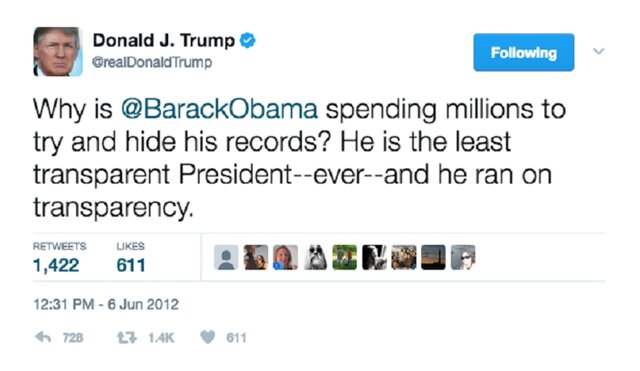 Вот что он написал в своем твиттере в 2012 году: "Почему Обама считает, что он не должен предоставлять отчетность, которую его предшественники предоставляли по собственному желанию? Что-то скрывает?"