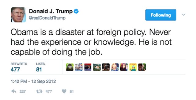 Трамп делал критические замечания по поводу Обамы накануне выборов 2012 года, заявив, что Обама – это "катастрофа в области внешней политики. Никакого опыта или знаний".