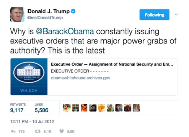 Трамп последовал примеру Обамы, выпуская один за другим указы президента, которые он назвал "крупнейшим захватом власти."