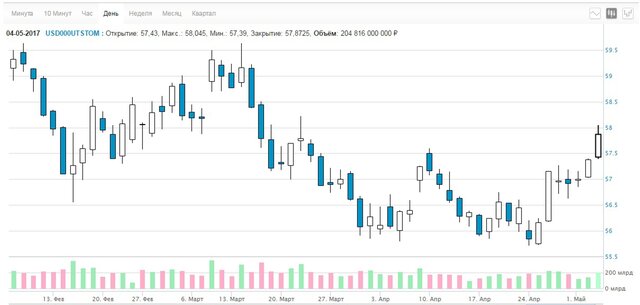 График курса доллара за период с февраля по май 2017 г. Источник - Мосбиржа.