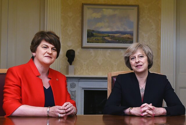 Лидер Демократической юнионистской партии (ДЮП) Арлин Фостер (слева) и премьер-министр Великобритании Тереза Мэй (справа). Фото: IBTimes UK