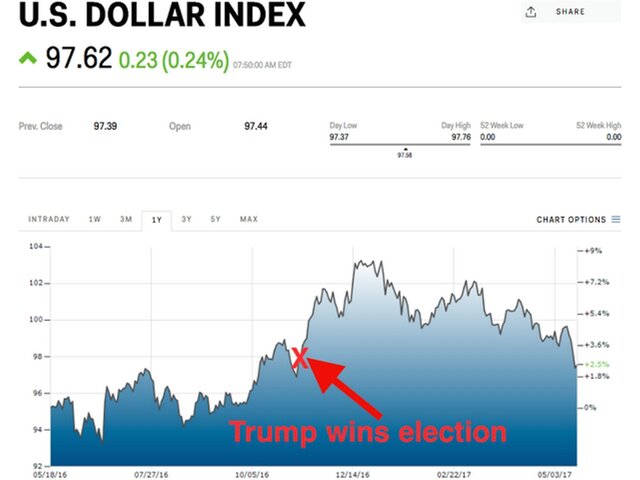 Индекс составлял 97,861 при закрытии торгов 8 ноября, в день президентских выборов в США.