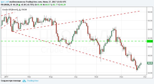 Ну а на рынке нефти тем временем уже четвертый день подряд наблюдается рост. Котировки смеси Brent прибавляют около 1%, торговля ведется в районе отметки $46,35. Впрочем, учитывая те темпы, которым нефть снижалась до этого, пока текущий подъем - не более чем восстановительная коррекция.