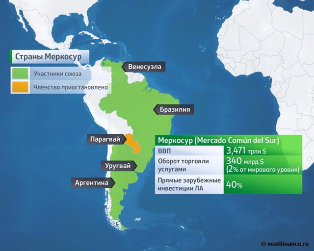 Меркосур - общий рынок стран Южной Америки, объединяющий Аргентину, Уругвай, Парагвай и Бразилию. Как полноправное объединение образовано в 1991 г., когда в парагвайской столице Асунсьоне подписан договор о создании таможенного союза и общего рынка. В странах Меркосур проживают 250 млн человек, которые производят 75% совокупного ВВП Южной Америки.