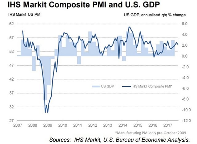 "Экономика США продемонстрировала обнадеживающую устойчивость в течение месяца, когда были перебои из-за ураганов. Хотя результаты сентябрьских опросов свидетельствуют о замедлении роста деловой активности, общие темпы роста оставались стабильными, - сообщил главный экономист Markit Крис Уильямсон. - Исторические сопоставления PMI с ВВП свидетельствуют о том, что опросы указывают на рост экономики в годовом выражении чуть более чем на 2% в III квартале".