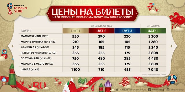 Как и на Чемпионатах мира по футболу в 2010 и 2014 гг, граждане страны-хозяйки ЧМ получат эксклюзивное право на приобретение отдельной категории билетов по специальной цене (от 1280 рублей).Минимальная цена билета на матч открытия мирового первенства с участием сборной России составит 3200 рублей. Минимальная стоимость билета на финальную встречу составит для российских граждан 7040 рублей.