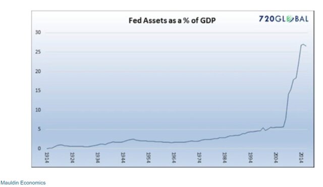 И первым шагом в нашей "экскурсии" по нелепым ошибкам станет график Майкла Лебовица из 720 Global. На графике отражен рост активов ФРС в процентах от ВВП.Вы можете заметить небольшое изменение тенденции с 2008 года.