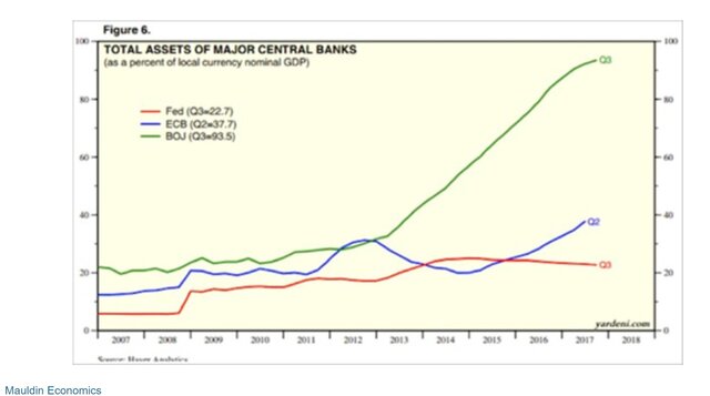 ЕЦБ и Банк Японии увеличили свои балансы больше, чем в США. Баланс Банка Японии почти в пять раз больше по отношению к ВВП. И он еще растет.