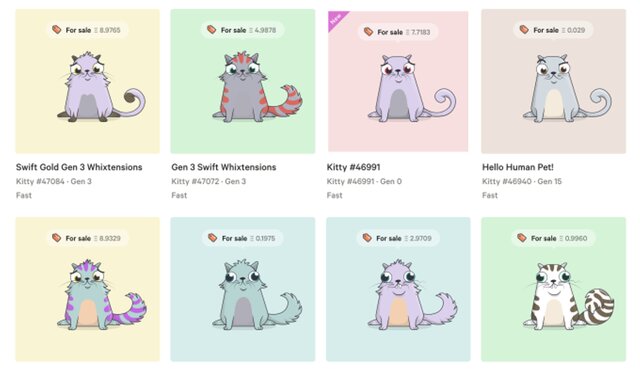 Средняя цена котенка составляет 50 эфиров (около $23 тыс), а самый дорогой котенок был продан за 246 эфиров (около $113 тыс). Цены постоянно колеблются и растут с огромной скоростью. Сейчас самый дешевый котенок обойдется в 0,03 эфира ($12). Сам курс эфира на данный момент составляет $464 за один токен.
