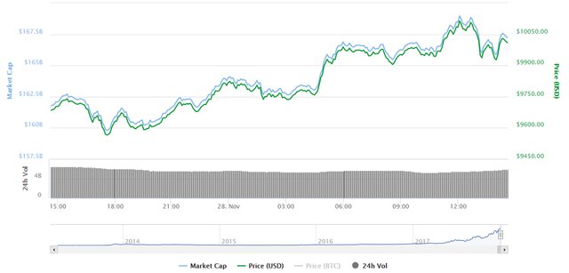 По данным сервиса Coinmarketcap, в настоящий момент средневзвешенная цена биткоина находится в районе $10015.