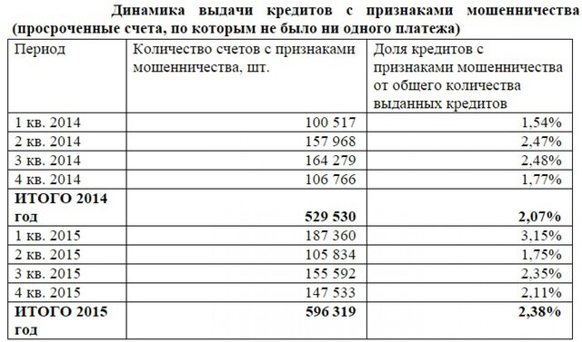В 2015 г. было зафиксировано 596 тысяч кредитов, обслуживание которых не осуществлялось заемщиками с первого месяца действия кредитного договора, то есть, имеющих признаки кредитного мошенничества. Это на 12,6% больше аналогичного показателя 2014 г.