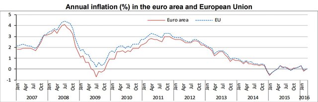 На мартовском заседании Европейский центральный банк (ЕЦБ) резко снизил прогноз инфляции в еврозоне на текущий год - с 1% до 0,1%, на 2017 г. - с 1,6% до 1,3%. В 2018 г. ожидается рост потребительских цен на 1,6%.