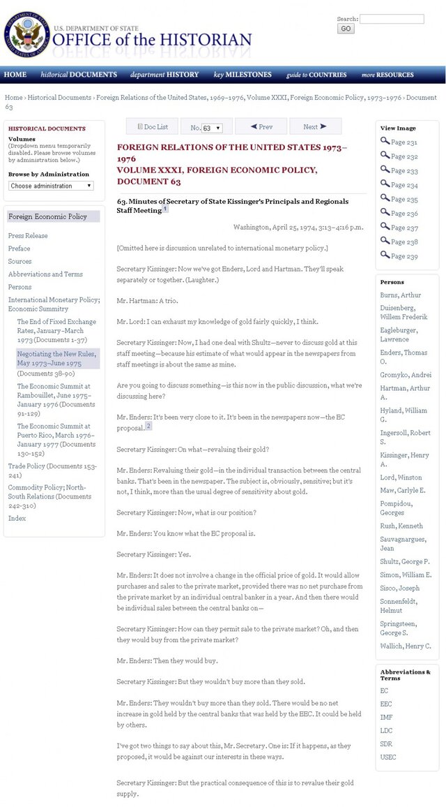 Cтенограмма встречи Госсекретаря США Генри Киссинджера с его помощниками, входе которой обсуждаются вопросы сдерживания цен на золота и заинтересованности в этом со стороны США, также действительно опубликована в архиве Госдепартамента США.