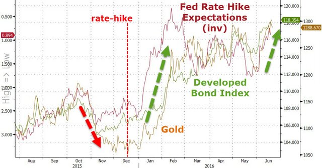 Тенденция вряд ли изменится в ближайшее время, так как доверие к Федеральной резервной системе снижается крайне активно (красная линия на графике – инверсия изменения ожиданий по ставке ФРС США), а цены на золото (золотая линия) и облигации развитых стран (зеленая линия) взлетели до максимума.