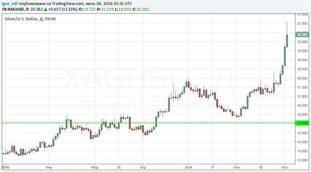 Рост отношения цены золота к серебру указывал на то, что серебро становится слишком дешевым, и эта диспропорция должна была рано или поздно исчезнуть. Так и произошло: в последние дни серебро демонстрирует феноменальные темпы роста, особенно после того, как британцы проголосовали за выход из состава ЕС.