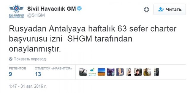 29 августа 2016 г. премьер-министр Дмитрий Медведев подписал постановление о полном возобновлении чартерных авиарейсов в Турцию с условием обеспечения безопасности пассажиров.Чартерные авиаперевозки российских туристов в Турцию были прекращены в ноябре 2015 г., когда турецкие военные сбили российский истребитель Су-24 на границе Сирии, а один из пилотов был расстрелян с земли террористами.