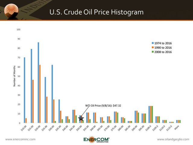 На графике отражены цены за три временных периода: с 1974 по 2016 год, с 1990 до 2016 и с 2008 до 2016 года, и закрытие WTI 8 сентября 2016 года на отметке $47,32 за баррель.