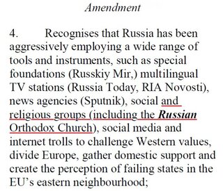 Признает, что Россия агрессивно использовала широкий спектр инструментов, таких как особые фонды (Русский Мир), многоязычные телеканалы (Russia Today, РИА Новости), новостные агентства (Sputnik), социальные и религиозные группы (включая Русскую Православную Церковь), социальные меди и интернет-троллей для того, чтобы оспаривать европейские ценности, разделить Европу, добиться поддержки внутри страны и создать впечатление того, что страны в Восточной Европе являются недееспособными;
