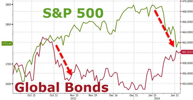 На графике видно, что рынок акций не только не упал, но даже и продолжал расти, и только к концу года, когда трежерис начали восстанавливать утраченные позиции, фондовые индексы пошли вниз. Следующая волна распродаж накрыла рынок госдолга США уже в 2014 г. Как и в предыдущем случае, рынок акций демонстрировал чудеса устойчивости, но длилось это недолго.