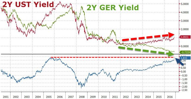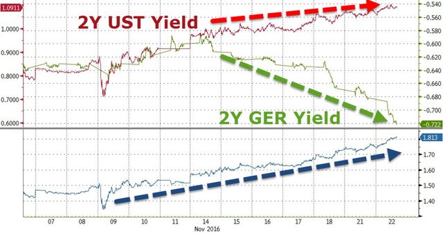 Стоит отметить, что сейчас на долговом рынке можно наблюдать крайне любопытную картину. Пока инвесторы распродают американские трежерис, доходности двухлетних облигаций Германии ставят новые рекордные минимумы - минус 72 базисных пункта.