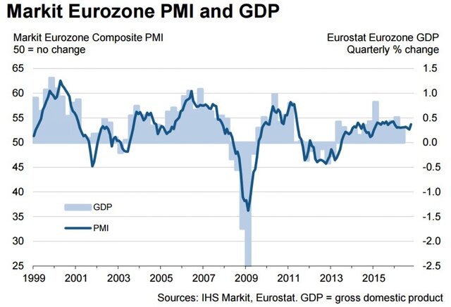 В то же время производственный PMI еврозоны вырос с 52,6 пункта до 53,3 пункта, достигнув максимума за 30 месяцев.