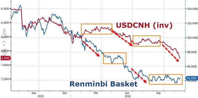 На графике, который приведен выше, можно отметить одну любопытную закономерность. Народный банк Китая чередует ослабление юаня к доллару и к корзине валют. Если юань падает к доллару, то к корзине он остается стабильны, если же юань ослабляют к корзине, то в паре с долларом он сохраняет стабильность.