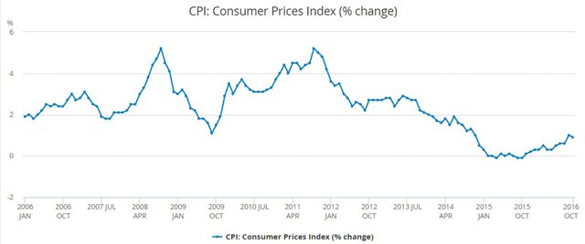 Инфляция в Великобритании остается ниже целевого уровня Банка Англии, составляющего 2%, с 2013 года. По оценкам ЦБ, инфляция в стране ускорится до 2,4% к 2018 году на фоне ослабления фунта стерлингов.