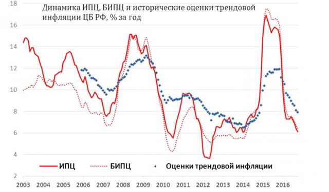 ЦБ использует в качестве уровня трендовой инфляции медианное значение из трех оценок, полученных на основе выделения ненаблюдаемой общей компоненты из набора ценовых показателей с помощью динамических факторных моделей (индекс потребительских цен, базовый индекс ПЦ). Начиная с октября 2016 г. показатели трендовой инфляции рассчитываются на скользящем 5-летнем периоде.