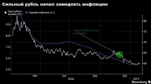 Но теперь эта формула не работает. Рубль, чей крах более двух лет назад был причиной резкого роста инфляции в 2015 г., начинает работать в пользу российских потребителей после ралли более чем на 25% в течение последних 12 месяцев.