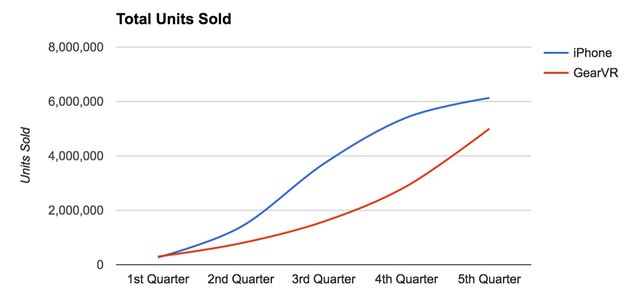Поскольку чаще всего экосистему VR противопоставляют мобильной, то сравнение проводилось между хэдсетом Gear VR и Apple iPhone. Первый смартфон купертинцев дебютировал в 2007-м. Сейчас продажи измеряются в 700 тыс. штук только за первый уик-энд с начала продаж новой модели. Но за первый год с момента анонса было продано 6 129 000 "айфонов".