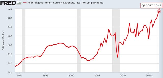 Впервые в американской истории расходы американского правительства на выплаты процентов по своему долгу превысили полтриллиона долларов.