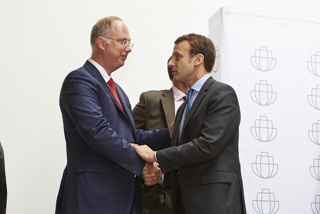Гендиректор РФПИ Кирилл Дмитриев и бывший министр экономики Франции Эммануэль Макрон на заводе Arc, портфельной компании РФПИ. Фото: Пресс-служба РФПИ