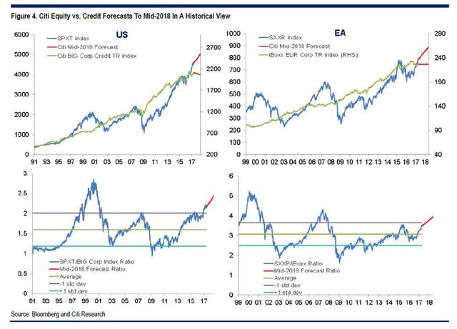 Это важно, потому что, как пишет аналитик Citi, "учитывая, что наши коллеги обеспокоены смягчением ЕЦБ и стратеги на фондовом рынке сосредоточены на доходах, такое расхождение вполне может произойти, но с исторической точки зрения это будет аномалией. Единственное, когда мы видели такое направление движения – поздний цикл в 1999 и 2006 годах. В обоих случаях кредит, по сути, дал понять, что происходит падение акций".