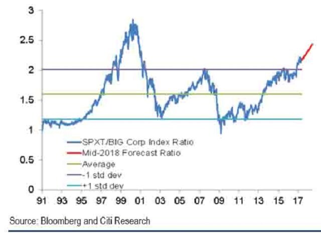 Однако это еще предстоит проверить, рассмотрев данные о потоке средств за первый квартал 2017 года. Устойчивое снижение корпоративного левериджа, по нашему мнению, оправдает переход к избыточному кредитованию против акций.