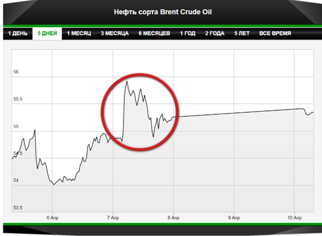 На "ударных" новостях в минувшую пятницу фиксировался всплеск нефтяных цен. Так, стоимость фьючерса на нефть марки Brent с поставкой в июне 2017 г. утром 7 апреля в ходе торгов на бирже ICE в Лондоне выросла на 1,5% и достигла $56,05 за баррель.