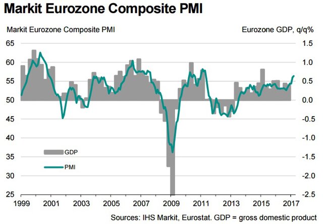 Сводный PMI Франции в марте вырос с 55,9 до 56,8 пункта - максимума за 70 месяцев. Индикатор активности в сфере услуг также оказался на максимуме за 70 месяцев: 57,5 пункта по сравнению с 56,4 пункта в феврале.