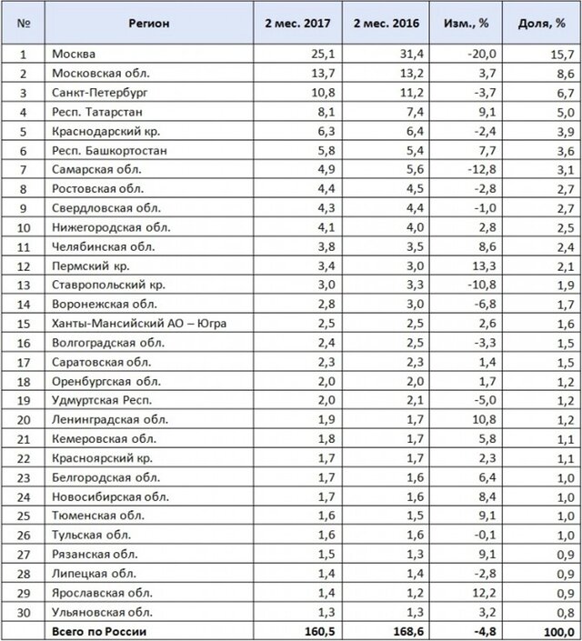 Стоит отметить, что по итогам января – февраля 2017 года на перечисленные 10 регионов-лидеров приходится свыше половины (54,5%) российского рынка новых легковых автомобилей. Среди регионов, входящих в ТОП-30, положительная динамика рынка отмечена у 18.