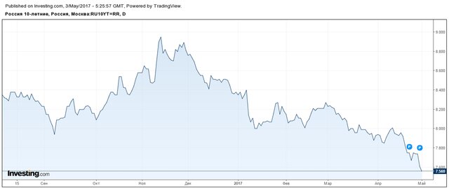 Как бы то ни было, на вторичном рынке мы видим позитивную динамику, даже падение цен на нефть не мешает инвесторам покупать российские бонды. Доходность десятилетних ОФЗ накануне опустилась до 7,56%. Возможно, это как раз и есть реакция на заявление ЦБ об инфляционных ожиданиях.