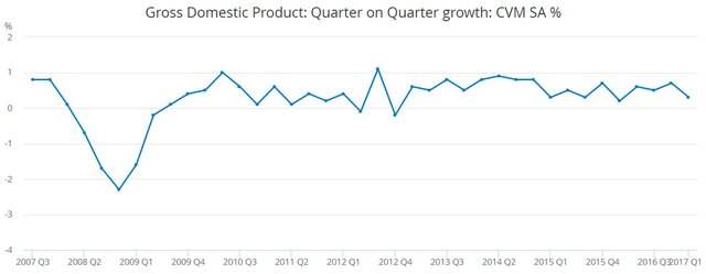 Рост экономики в I квартале замедлился до 0,3% с 0,7% в IV квартале 2016 г., свидетельствуют предварительные данные Национального статистического управления (ONS).