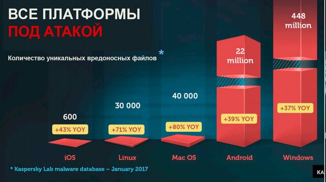 Лидирует здесь Microsoft с 448 млн. уникальных вредоносов, рост их числа в сравнении с прошлым годом достаточно серьезный. Тренд, который мы видим, говорит о том, что чем более массовой становится платформа, тем более она привлекает тех, кто попытается ее взломать и использовать в своих интересах. Ожидается, что в этом году вырастет число вредоносов и для iOS, несмотря на то, что эта платформа является сама по себе достаточно изолированной.