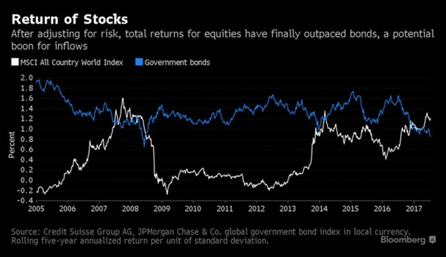 По данным Credit Suisse Group AG, скользящий пятилетний показатель дохода от мировых акций с учетом стандартного отклонения в течение последних трех месяцев превышал прибыль по гособлигациям. Это увеличивает вероятность притока средств в акции, возможно, в ущерб бондам.