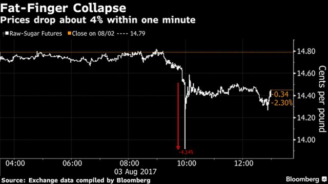Резкий спад, "возможно, обусловлен большим заказом на продажу или даже ошибкой, допущенной при электронном заказе, известной как "толстый палец", пояснил Бруно Занетти, старший аналитик по рынку сахара INTL FCStone в Кампинасе, Сан-Паулу.
