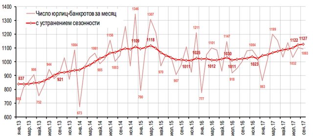 На фоне продолжающейся стагнации экономики число банкротств растет четвертый квартал кряду и даже немного превзошло максимальные значения кризисного 2015 г. Численность юрлиц-банкротов в III квартале 2017 г. в годовом выражении также выросла - на 12,4% больше, чем в III кв. 2016 г.