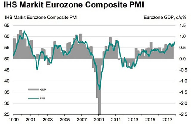 Сводный индекс деловой активности (Purchasing Managers Index, PMI) 19 стран еврозоны в ноябре повысился с октябрьского уровня 56 до 57,5 пункта, свидетельствуют окончательные данные IHS Markit. Показатель совпал с предварительной оценкой.