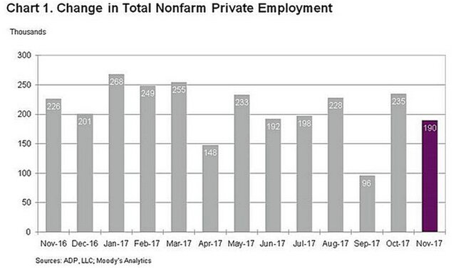 Экономисты, опрошенные Reuters, прогнозируют рост числа рабочих мест в частном секторе США на 190 тыс. в ноябре после увеличения на 252 тыс. месяцем ранее. По оценкам аналитиков, общее количество рабочих мест в экономике страны увеличилось на 200 тыс., показатель безработицы остался на уровне 4,1%.