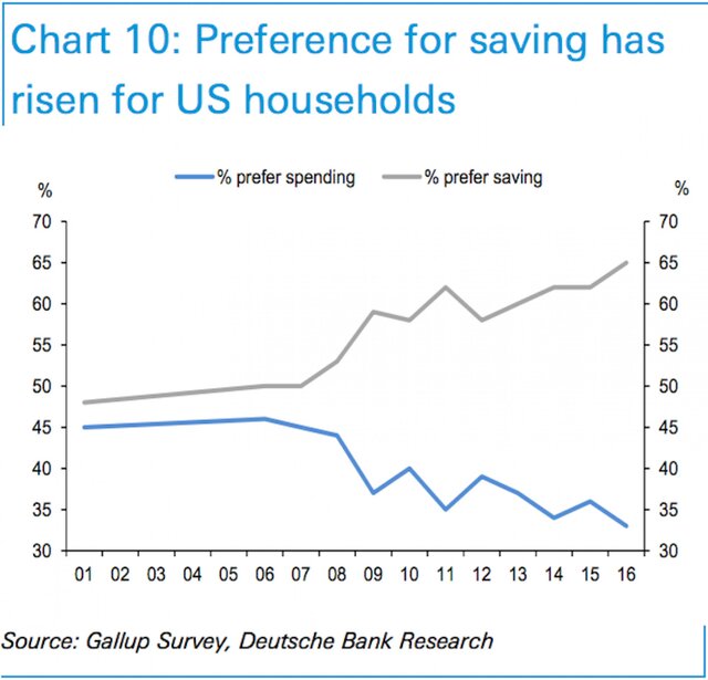 В своем докладе Deutsche Bank представил график, в котором явно отражено предпочтение американцев к экономии, а не трате средств в условиях финансового кризиса.